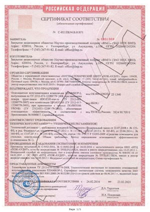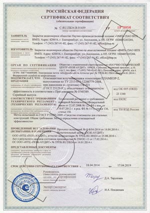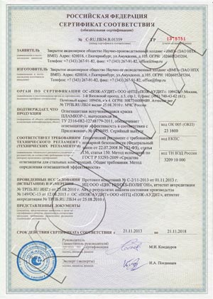 Все огнезащитные материалы прошли сертификацию на соответствие требованиям пожарной безопасности. Совместимость материалов ПЛАМКОР с грунтовкой ГФ-021 и цинкнаполненными материалами ВМП подтверждена результатами комплексных испытаний.